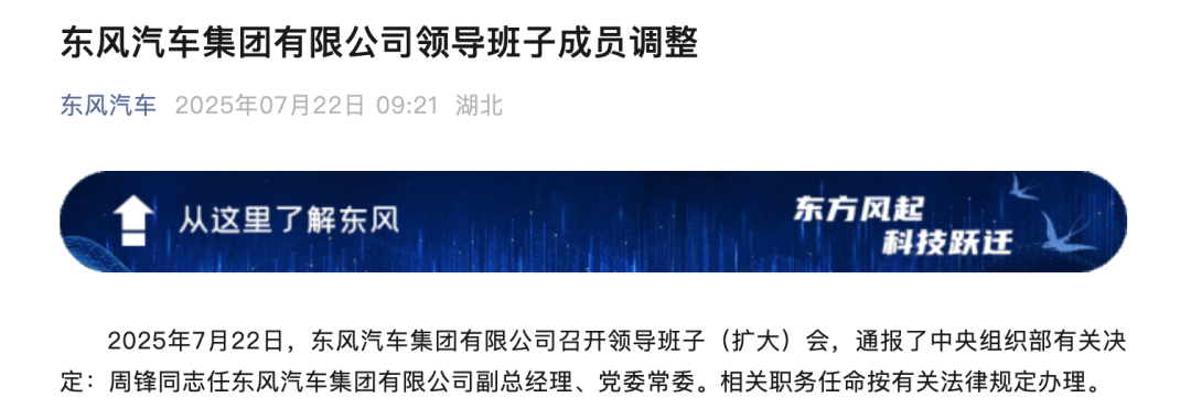 7月22日,东风汽车集团有限公司召开领导班子扩大会,通报中央组织部有关决定:周锋同志任东风汽车集团有限公司副总经理、党委常委。相关职务任命按有关法律规定办理。