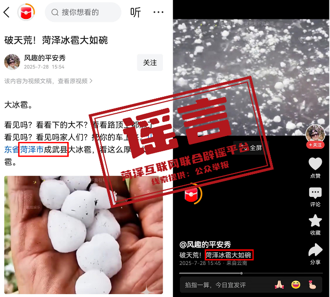2025年7月28日,有网民在某平台发布内容为“菏泽冰雹大如碗”“成武县大冰雹”的图文及视频,引发网民关注。经核实,网传视频系网民为蹭热点、博流量恶意拼凑剪接而成,为不实信息。