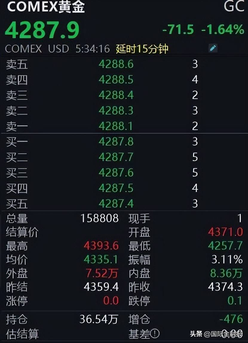 期货方面,COMEX黄金期货亦出现回调。截至记者发稿,COMEX黄金期货日内跌1.64%,报4287.9美元/盎司,盘中最高触及4393.6美元/盎司,最低则跌至4257.7美元/盎司。