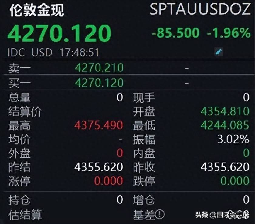 10月21日,国际金价在短暂冲高后急速下跌。截至记者发稿,伦敦金现报4270.12美元/盎司,日内跌1.96%,盘中最高触及4375.49美元/盎司,最低则跌至4244.085美元/盎司。