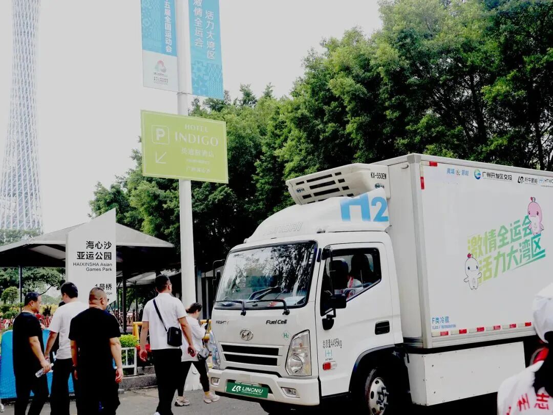 在2025年11月于粤港澳大湾区举行的第十五届全国运动会上,羚牛氢能在广州开发区交投集团的统筹下,与荣达餐饮集团协作,负责全运会工作人员的餐饮配送,实现了4.5吨氢能冷链车在国家级赛事中的首次餐饮配送。