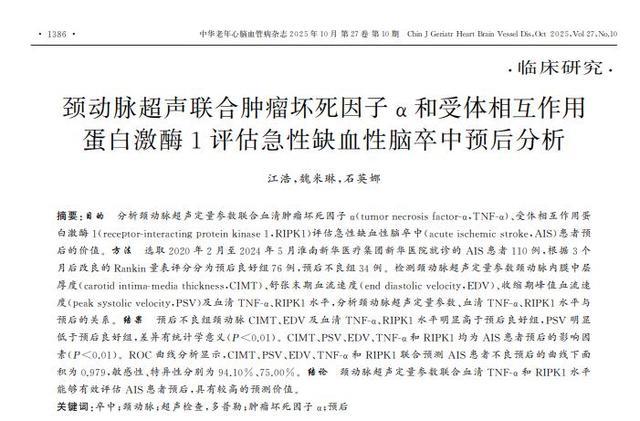颈动脉超声联合肿瘤坏死因子α和受体相互作用 蛋白激酶1评估急性缺血性脑卒中预后分析,江浩,中华老年心脑血管病杂志,2025-09-29